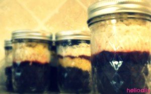 I used Melted Chocolate Chips in my jars. BAD IDEA!! The chocolate got hard so now people are going to have trouble eating it because they are going to have to crack the chocolate shell to get to the chocolately and marshmallow goodness. 😦 SORRY! This is why you should use chocolate fudge or chocolate pudding.
