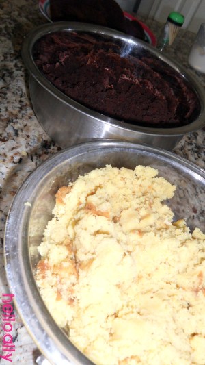I suggest, you add chocolate cake crumbs first, follow by one of the liquid ingredients, then yellow cake crumbs and finish off with the fudge and some chocolate & yellow cake crumbs mixed.